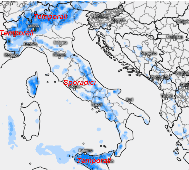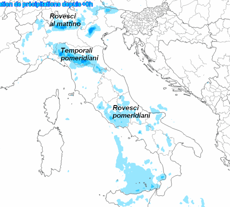 Rovesci al mattino tra alta Lombardia, Veneto orientale e Friuli, in attenuazione con l’incedere del soleggiamento. Nel pomeriggio-sera si potrebbe ripresentare qualche temporale limitatamente alle Alpi, ma senza sconfinamenti in pianura. Temporali pomeridiani sull’Appennino Ligure orientale e Tosco-Emiliano, in attenuazione in serata. Rovesci e qualche temporale pomeridiano anche nelle aree interne tra Lazio e Abruzzo, per il resto assenza di fenomeni.