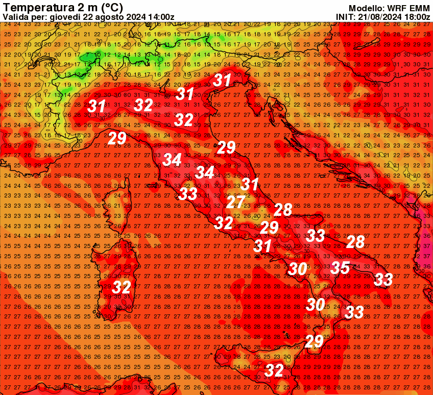 Valori termici vicini alla media del periodo. Segnaliamo punte di 35° sulla Lucania e 34° nelle aree interne di Toscana e Lazio. Questo è il DISAGIO da CALDO atteso in Italia nella giornata odierna e nei prossimi giorni.