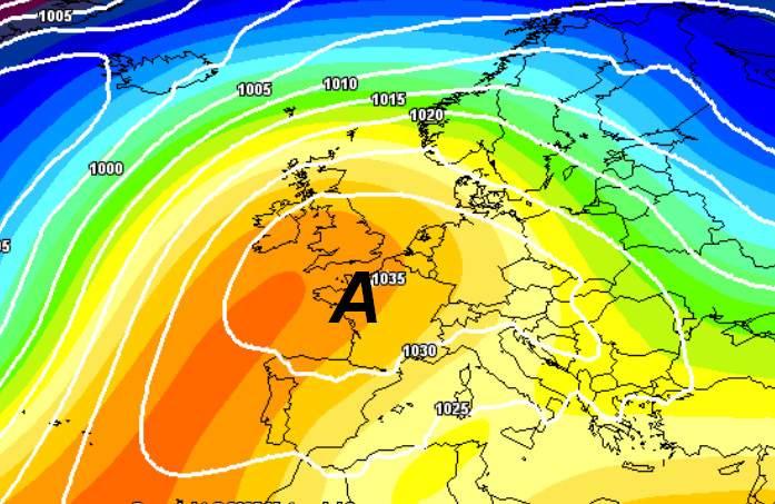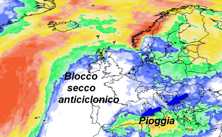 Osservate il blocco secco delimitato da un forte anticiclone che impedirà alle perturbazioni di transitare sul nostro Continente. Le regioni centro-settentrionali italiane saranno sotto la stabilità quasi completa, mentre il meridione (principalmente la Sicilia e la Calabria) avrà probabilmente tempo un po’ instabile con brevi rovesci intermittenti (in giallo) accompagnati da un clima anche un po’ freddo, ecco il dettaglio: