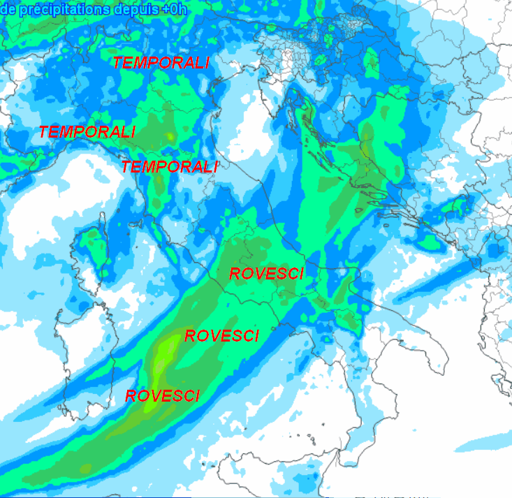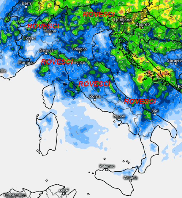 Una goccia fredda di questo tipo NON potrà garantire la stabilità sulla nostra Penisola. Infatti, se analizziamo la mappa delle precipitazioni attese in Italia fino alla mezzanotte prossima, notiamo quanto segue: