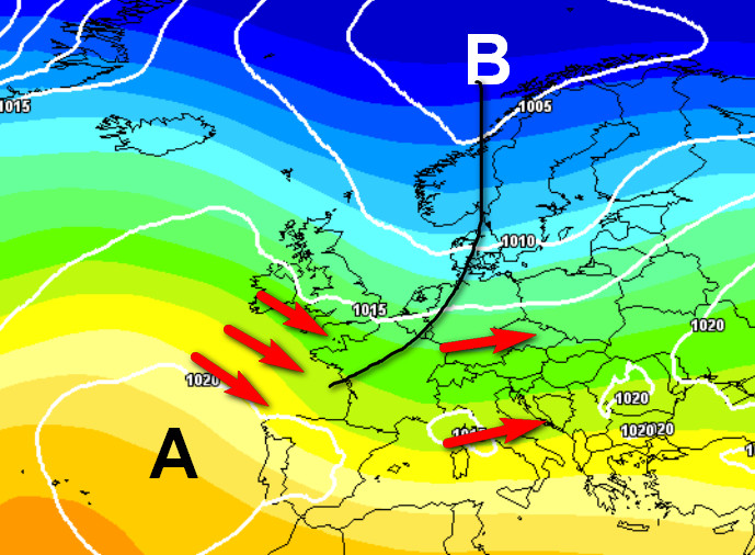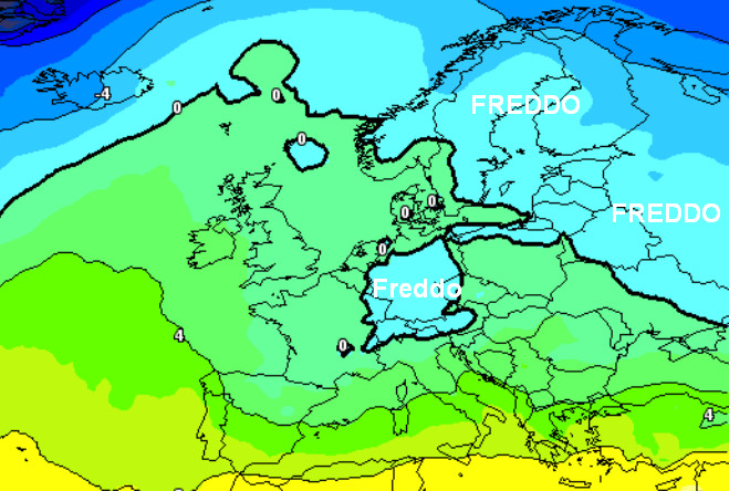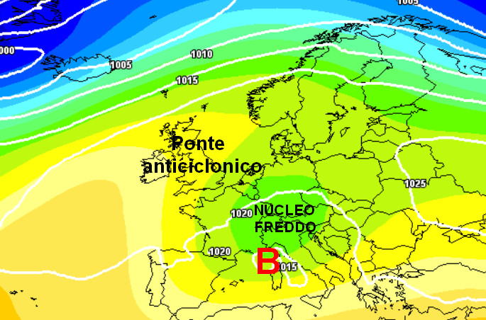 Un nucleo freddo proveniente dall’Europa orientale si piazzerà tra il settentrione e l’Europa centrale (la posizione esatta risulta però ancora incerta). Questa situazione, oltre a portare generali condizioni di maltempo sull’Italia, determinerà anche un calo delle temperature specie sul settore centro-settentrionale della nostra Penisola. Notate inoltre il vasto ponte di alta pressione che ricoprirà la Scandinavia e tutti i settori settentrionali del Continente, dove avremo un periodo con aria stabile e molto mite.
