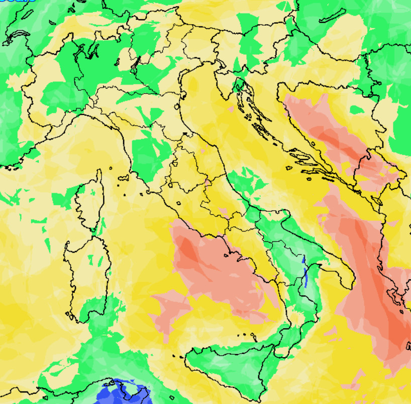 Mentre questa è la mappa della probabilità di pioggia in Italia valida per il medesimo giorno. In blu probabilità di pioggia bassa (sotto al 25%), in verde medio-bassa (fra 25 e 50%), in giallo medio-alta (fra 50 e 75%) e in rosso alta o molto alta” (oltre il 75%).