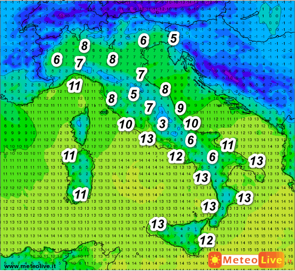 Al nord e al centro temperature quasi ovunque sotto i 10°. Relativamente più mite il clima al sud e sulle Isole con circa 11-13°.