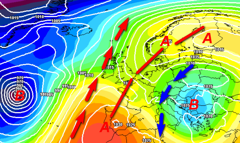 Partiamo dall’Oceano Atlantico che vedrà l’isolamento di una vasta depressione; più ad est si alzerà invece alzare un promontorio sub-tropicale che interesserà parte dell’Europa occidentale. Il suddetto promontorio potrebbe poi fondersi tramite un ponte anticiclonico ad un’altra zona di alta pressione situata in sede scandinava, bloccando completamente il flusso occidentale in sede europea.