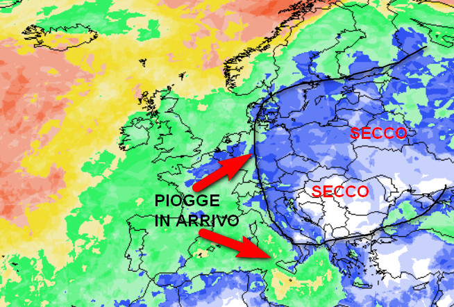 Infine, questa è la mappa della probabilità di pioggia in Europa valida per la medesima giornata, ovvero domenica 10 novembre: In blu probabilità di pioggia bassa (sotto al 25%), in verde medio-bassa (fra 25 e 50%), in giallo medio-alta (fra 50 e 75%) e in rosso alta o molto alta” (oltre il 75%).