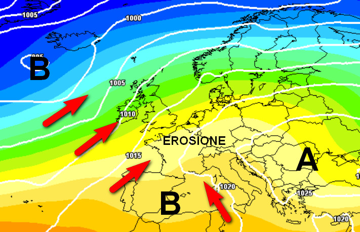 I massimi di pressione si sposteranno molto lentamente ad est, attenuandosi. Da ovest si faranno strada le prime piogge associate a perturbazioni atlantiche che piano piano penetreranno verso levante causando un lento cambiamento del tempo anche sull’Italia.