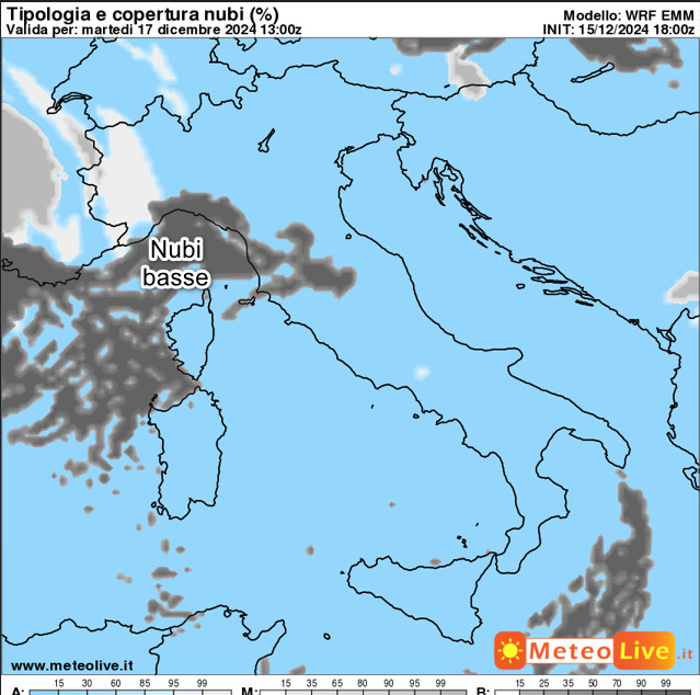 Infine, questa è la nuvolosità prevista in Italia attorno alle ore 14 di martedi 17 dicembre: