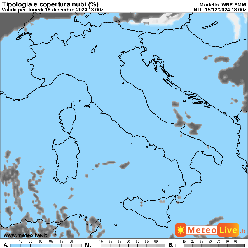 La prima cartina è la mappa della nuvolosità prevista in Italia alle ore 14 di lunedi 16 dicembre