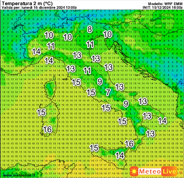 Queste sono le temperature attese in Italia alle ore 14 di lunedi 16 dicembre: