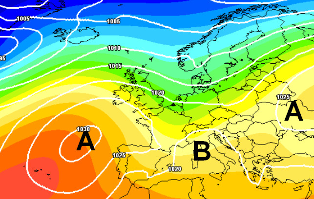Abbiamo accennato poco sopra a 2 massimi di pressione: uno in pieno Atlantico e l’altro sull’Europa orientale. In mezzo avremo un maltempo tutto italico, sotto le spoglie di una blanda depressione che si posizionerà approssimativamente sul centro Italia.