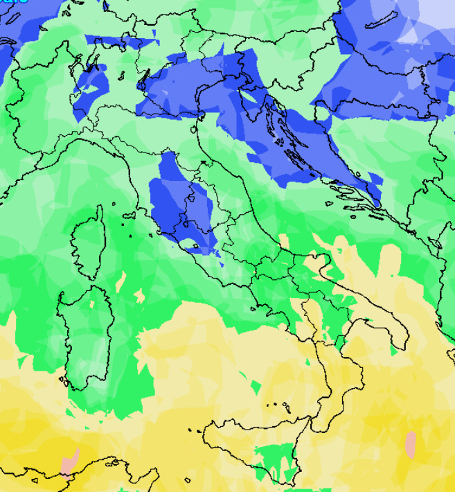 Probabilità di pioggia medio-alta o elevata al sud e sulla Sicilia, media sul resto d’Italia con zone a probabilità decisamente più bassa al settentrione, dove sarà più palese l’influenza dell’alta pressione.