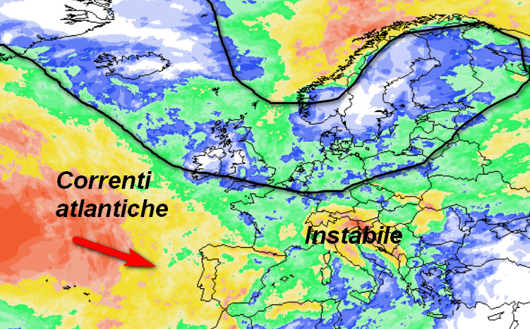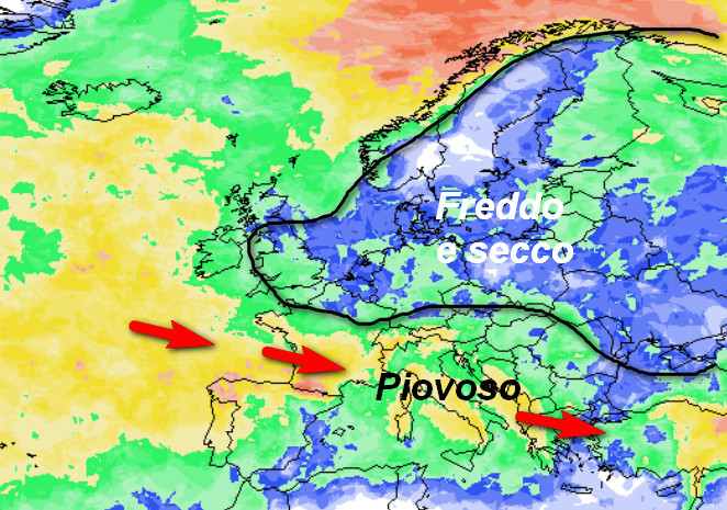 L’alta pressione associata a temperature piuttosto basse riguarderà le aree racchiuse nella linea nera ovvero dove la probabilità di pioggia sarà BASSA o NULLA, vale a dire sull’Europa centro-settentrionale ad eccezione del nord della Scandinavia. In Italia il tempo resterà instabile stante l’ingerenza di correnti atlantiche che saranno costrette a scorrere a latitudini basse ed a confluire almeno parzialmente con l’aria fredda presente più a nord. Tutto ciò darà origine a rovesci sparsi ed a nevicate sui rilievi a quote tutte da verificare.