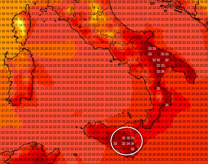 Le correnti di Libeccio risulteranno ulteriormente riscaldate dalla ricaduta favonica sui versanti sottovento della Sicilia e della Puglia, dove si raggiungeranno punte di 35°C a Catania e di 34°C nel Tarantino, come mostra questa mappa, tanti i valori over 30°C sulla Puglia: