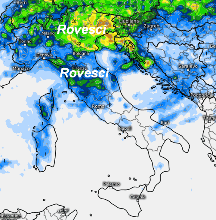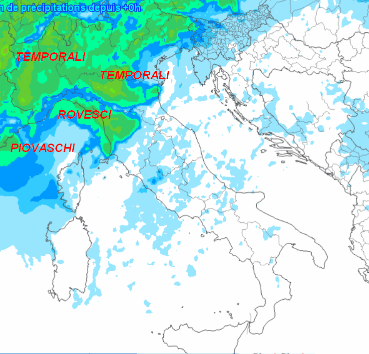La prima mappa mostra la sommatoria delle precipitazioni attese sul nostro Paese fino alla mezzanotte prossima: