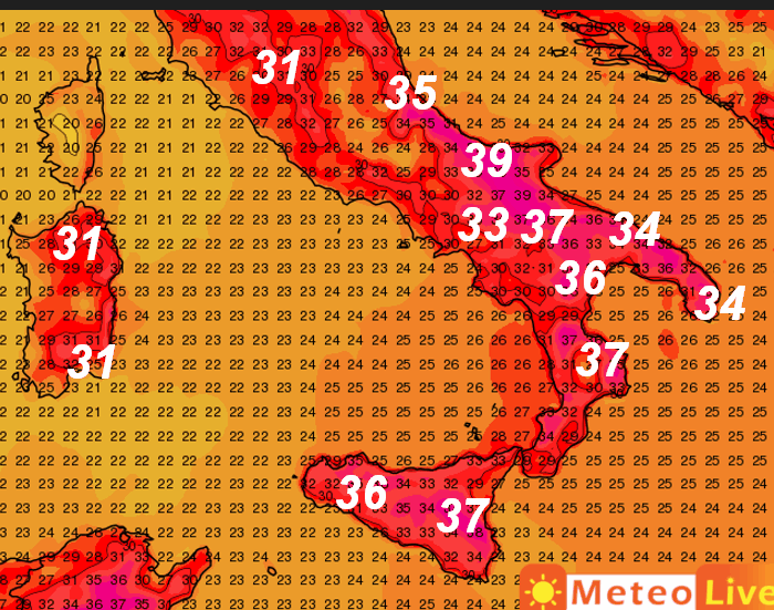 Punte di 39° nel Foggiano; 37-38° saranno possibili sulla Sicilia orientale, la Calabria Ionica ed alcune aree della Puglia; 36° sulla Lucania, 35° sul Molise.