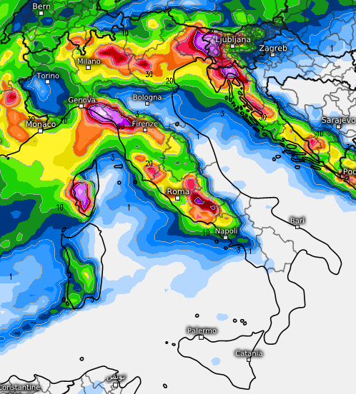 Si notano le precipitazioni su alto e medio Tirreno e su gran parte del nord, salvo nelle aree in ombra pluviometrica a causa del Libeccio (ovest Piemonte ed Emilia-Romagna). Più l’aria fredda riuscirà ad interagire con i vortici depressionari in arrivo dall’Atlantico e più il maltempo sarà “cattivo” sull’Italia e soprattutto più la neve potrà spingersi a quote basse sulle Alpi.