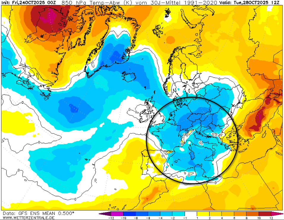 Passiamo adesso alle anomalie termiche a 1500 metri previste in Europa nelle ore centrali di martedi 28 ottobre: