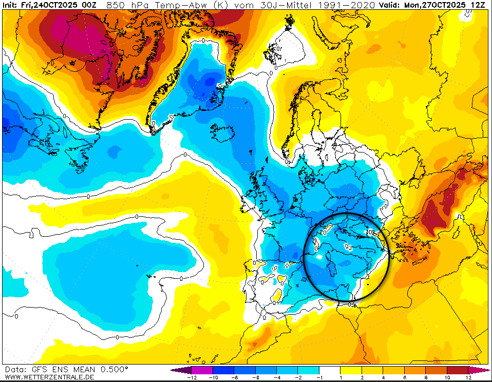 Focalizzando lo sguardo sull’Italia (cerchiata in nero), i valori termici a 1500 metri si prevedono al di sotto della media indicativamente tra i 2 ed i 4°, con una punta di in prossimità della Sardegna. Al nord i venti di caduta dalle Alpi limiteranno il sotto media termico che si prevede comunque tra 1 e 2°.