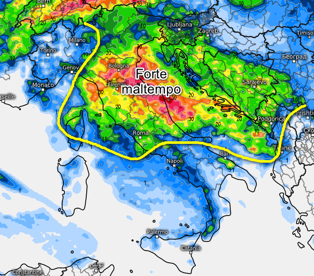 FORTE MALTEMPO con elevato rischio di NUBIFRAGI su Emilia Romagna, Toscana, Marche, Umbria e Abruzzo. Su queste regioni si temono fenomeni davvero violenti ed a carattere di nubifragio dove vedete il colore rosso sulla mappa. A seguire avremo intensi venti settentrionali che determineranno un sensibile calo delle temperature specie nelle aree raggiunte dai fenomeni più forti.