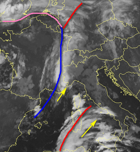 L’attesa perturbazione, un fronte freddo, si addossa in queste ore alle Alpi occidentali e sta già determinando piogge sul Piemonte occidentale. Presto verranno interessate anche la Liguria e la Lombardia, al momento ancora in attesa. Più a sud è presente invece un fronte caldo in risalita dal nord Africa; sta determinando piogge e qualche temporale tra la Sardegna e la Sicilia; si muoverà anch’esso verso levante alla volta del settore centro-meridionale italico. Tutto concorre quindi per una giornata di maltempo su diverse aree del nostro Paese.