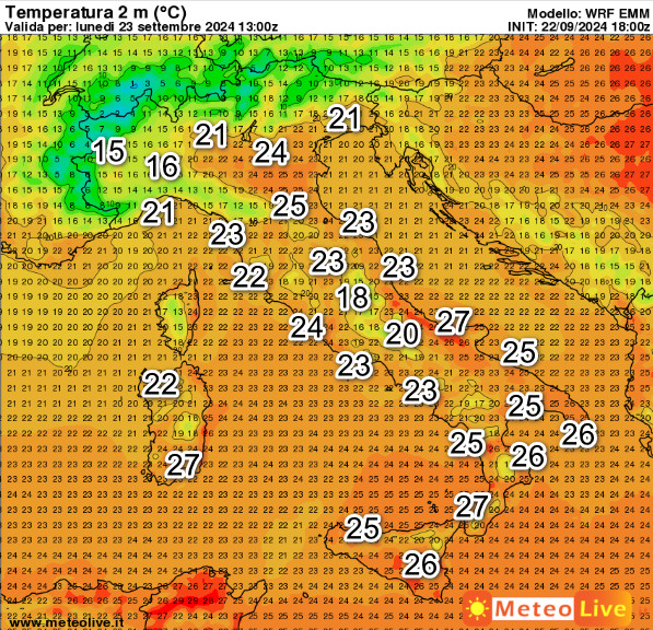 Temperature in sensibile calo al nord-ovest, con valori quasi ovunque sotto i 20° a causa delle piogge. Relativamente più caldo al meridione e sulle Isole con punte di 26-27°.