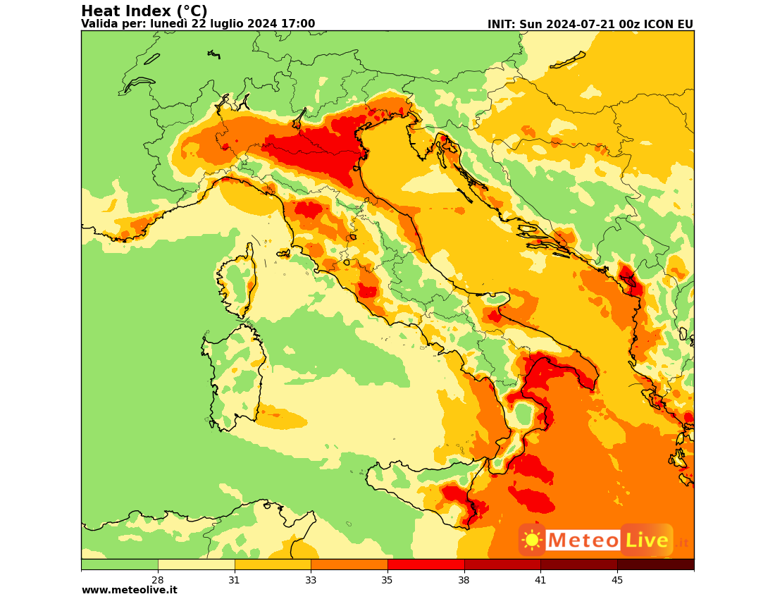 Ecco la mappa del disagio da caldo (temperatura percepita) previsto per lunedì alle 17 (AGGIORNATA A DOMENICA 21 LUGLIO ore 11:45):