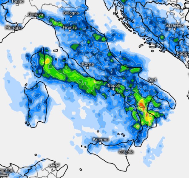 Abruzzo (specie in mattinata), Basilicata, bassa Campania, nord Calabria (nel pomeriggio-sera), sono le regioni con la più alta probabilità di temporali, che possiamo stimare intorno all’85% entro la serata di lunedì.