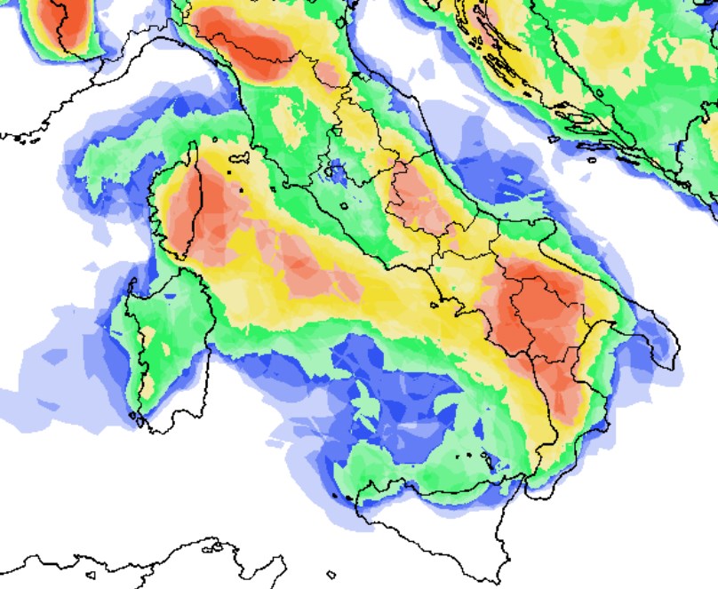 La mappa ECMWF seguente (aggiornamento di domenica ore 11:45), centrata per il centro e il sud Italia, evidenzia un diffuso rischio di temporali: