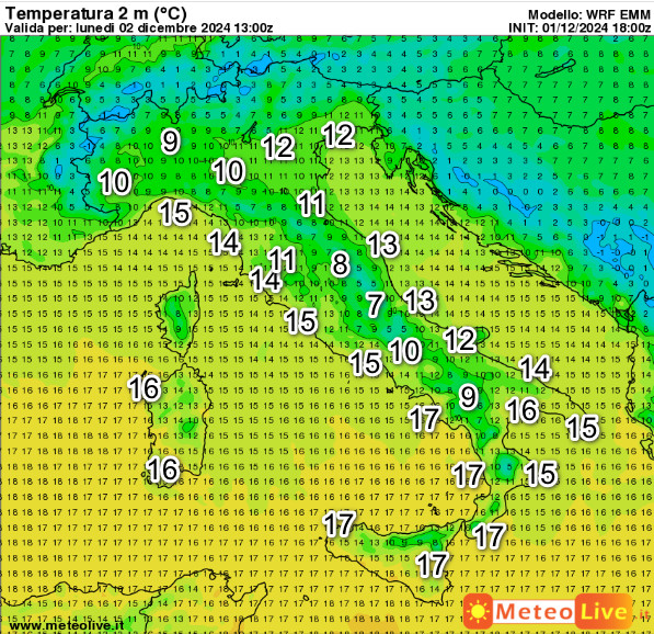 Questi sono i valori attesi in Italia alle ore 14 di lunedi 2 dicembre: