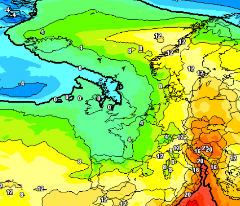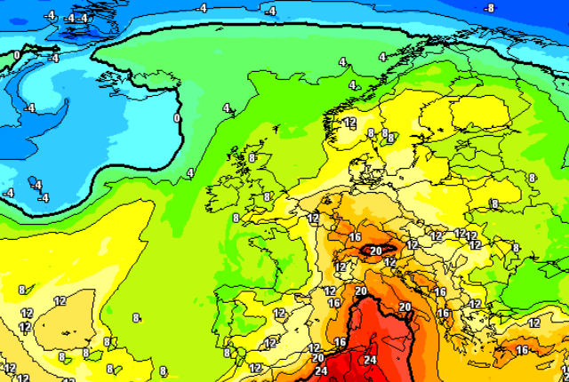 Ed analizziamo anche le temperature previste a 1500m nel momento di massimo fulgore anticiclonico: