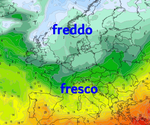 Guardate la mappa termica prevista a 1500m per sabato 23 agosto, farà persino freddo nel nord Europa e tutta l’Italia libera dal grande caldo: