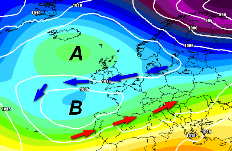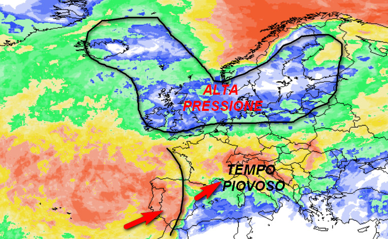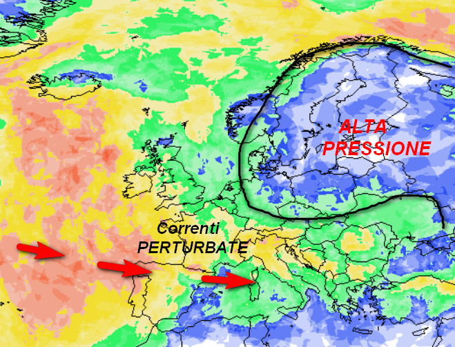 L’alta pressione ricoprirà lidi molto settentrionali e porrà un massimo tra la Scozia e l’Islanda. A sud della figura stabilizzante scorrerà aria fredda di diretta estrazione continentale che interesserà le Isole Britanniche e parte dell’Europa centrale. Sull’Italia e sull’Europa meridionale si imporrà invece un flusso sud-occidentale mite, ma umido con diverse perturbazioni che saranno obbligate a passare basse di latitudine, stante l’invadenza anticiclonica più a nord.
