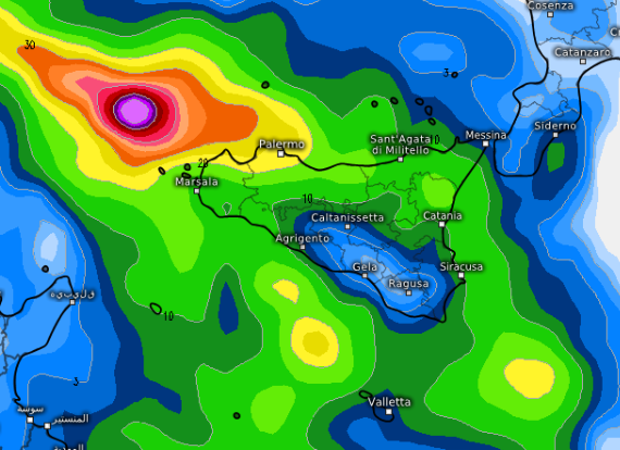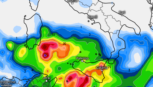 La situazione rimarrà bloccata per diversi giorni ma il maltempo tenderà ad estendersi verso est secondo la visione del modello, determinando un coinvolgimento anche della Calabria jonica e addirittura sin sulla punta del Salento, ma sarà sulla Sicilia occidentale che si rinnoverà il rischio di nubifragi, specie tra le Egadi, Trapani, Palermo e a seguire l’Agrigentino, come si vede in questa mappa prevista per il 17 ottobre: