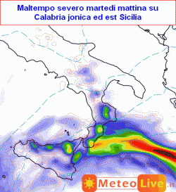 MALTEMPO: rischio di forti precipitazioni al sud, in particolare sulla Sicilia orientale e la Calabria jonica nella mattinata di martedì, quando si prevedono anche dei nubifragi. Anche su queste zone comunque il tempo tenderà a migliorare dal tardo pomeriggio di martedì.
