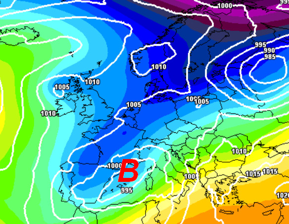La prima cartina mostra l’analisi sinottica attesa in Europa per le prime ore di venerdi 14 marzo: