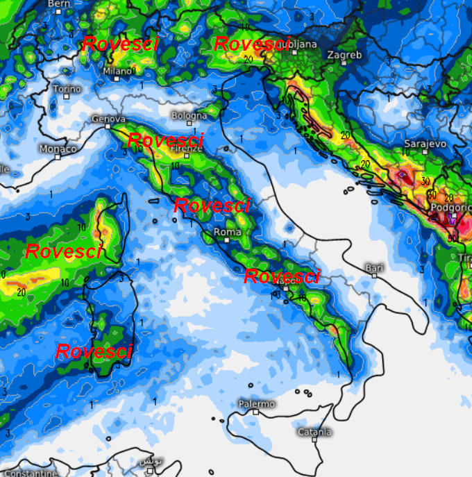 Rovesci sulla fascia alpina e prealpina centrale ed orientale con neve oltre i 1000-1200 metri. Rovesci anche lungo tutto il versante tirrenico e le aree interne con neve sull’Appennino settentrionale oltre i 1400 metri. Acquazzoni saranno possibili anche sui settori occidentali della Sardegna, per il resto piogge meno probabili. Ventoso per venti di Libeccio con mareggiate lungo le coste esposte.