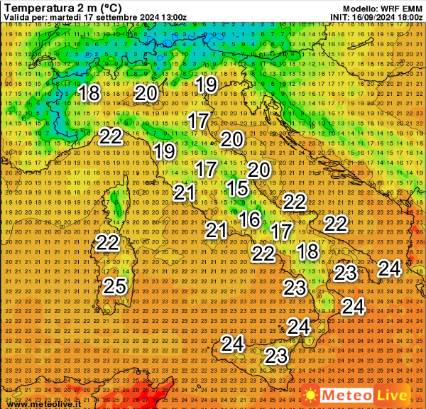 Valori in calo rispetto alla giornata di ieri, spesso sotto i 20° nelle aree interne del centro-sud e su alcuni settori della Pianura Padana. 25° si registreranno sulla Sardegna meridionale.