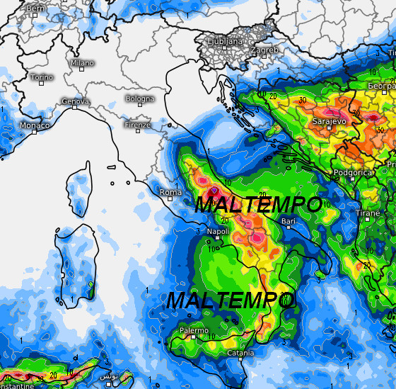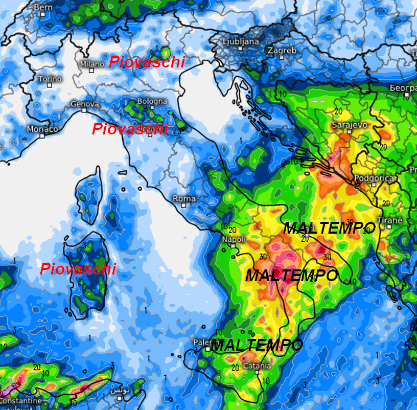 Maltempo su Abruzzo, Molise e su quasi tutto il meridione ad eccezione forse del nord della Campania che avrà piogge meno intense. Rischio di accumuli piovosi elevati su Molise, Puglia, Lucania e Calabria. Sul resto d’Italia tempo abbastanza buono e con temperature in aumento. Qualche piovasco non si esclude sulla Sardegna, ma senza accumuli importanti.