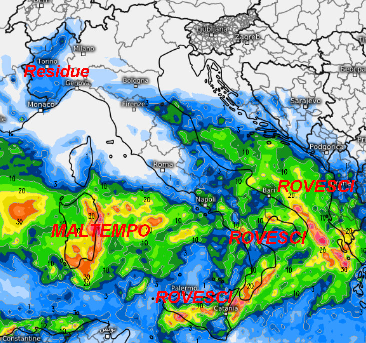 Maltempo su Sardegna, Sicilia e su tutto il meridione peninsulare fino all’Abruzzo e alle Marche, con piogge e TEMPORALI anche intensi, specie sulle zone colorate di rosso/arancione sulla mappa, quindi su Sardegna orientale e meridionale, gran parte della Calabria, provincia di Matera e gran parte della Puglia.