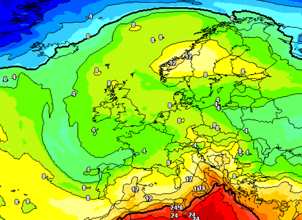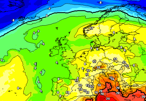 Vediamo qui sopra quanto il quadro barico sia inequivocabile. Guardate invece sotto anche a livello termico cosa si prevede a 1500m per metà settimana, guardate che gradiente termico orizzontale e verticale sperimenteremo: fresco quasi autunnale al nord, mitezza primaverile o quasi caldo al centro, caldo estivo al sud: