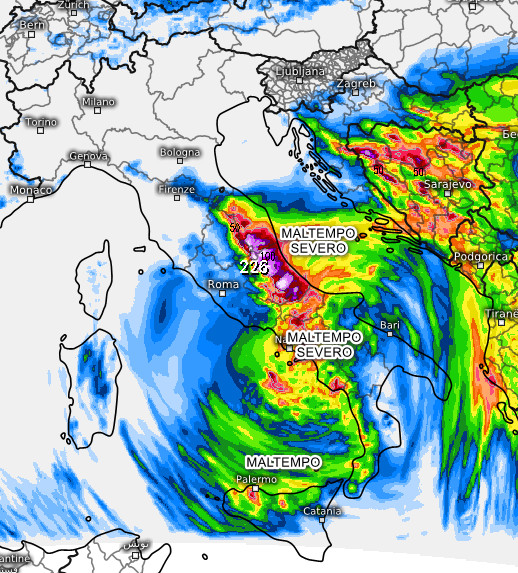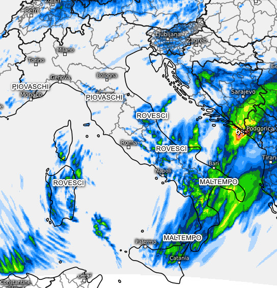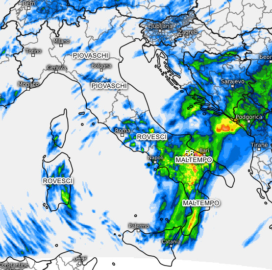 Sarà la giornata PEGGIORE per il meridione ed il medio versante adriatico, dove si prevede MALTEMPO anche SEVERO con piogge e temporali e rischio di alluvioni.