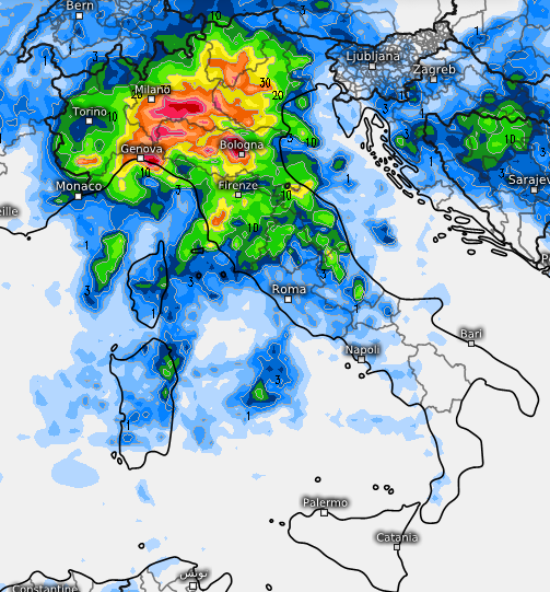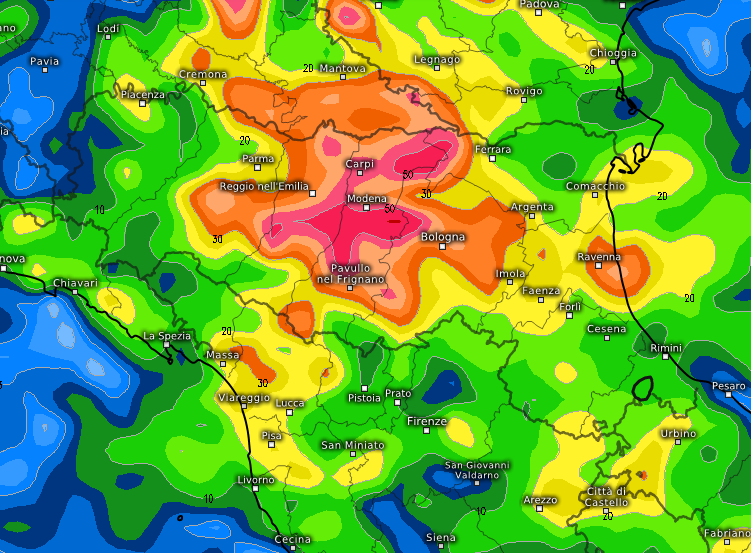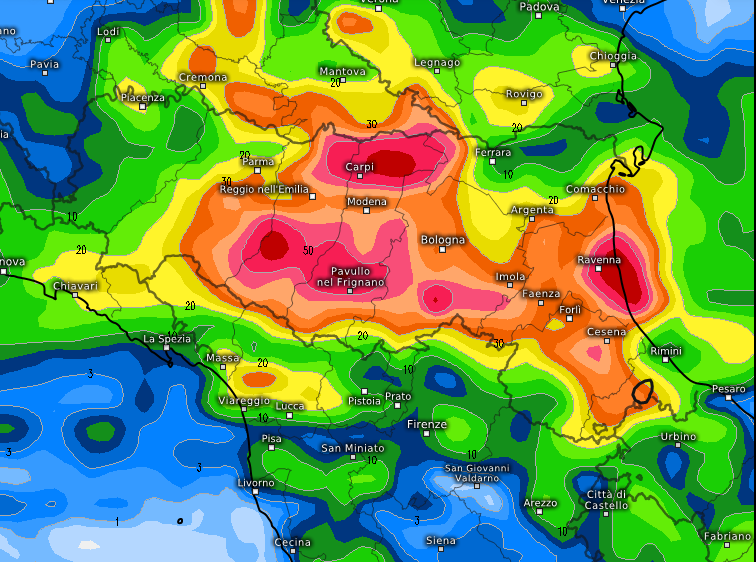 La posizione del vortice richiamerà costantemente aria umida da SE lungo l’Adriatico, esaltando la fenomenologia a ridosso dell’Emilia-Romagna, complice anche l’effetto stau indotto dalla presenza dell’Appennino. Ed è infatti qui che i fenomeni colpiranno in modo più convinto, continuo, anche pericoloso, come mostrano in modo eloquente queste mappe: