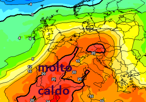 Si comincia con la situazione termica prevista per sabato 20 a 1500m, dove si nota tutta l’Italia abbracciata da temperature da piena estate con valori al suolo superiori a 30°C su alcune regioni: