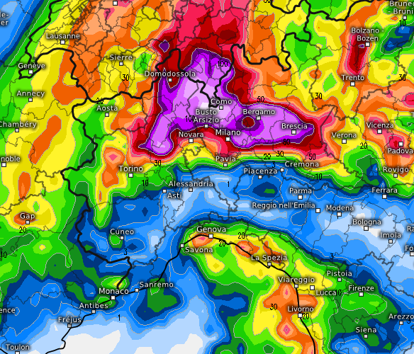 In viola sono segnalati gli accumuli più abbondanti che comprendono le aree tra Verbano-Cusio-Ossola, Varesotto, Brianza, Bergamasca, Bresciano, da notare una sorta di “ombra pluviometrica” tra il basso Piemonte, la bassa Lombardia e l’Emilia, indotta dalla forte ventilazione da sud, mentre per l’impatto diretto dell’aria umida da SSW potrebbe piovere molto su Liguria centro-orientale ed alta Toscana, ma non come sulla fascia montana e pedemontana del nord. Notevoli anche le piogge abbondanti attese sul Canton Ticino centro-meridionale, dal Mendrisiotto al Sopraceneri, dunque da Chiasso e Mendrisio, sino a Lugano e Bellinzona.