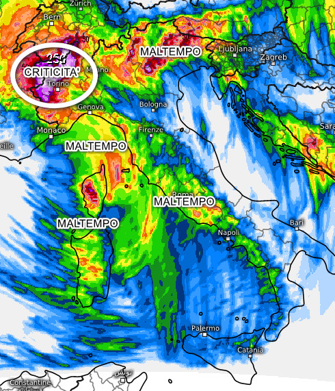 A fare le spese di questa complicata situazione saranno le estreme regioni nord-occidentali (Val d’Aosta, alto Piemonte, Alpi occidentali) che dovranno sopportare un carico di pioggia considerevole nelle prossime 36-48 ore.