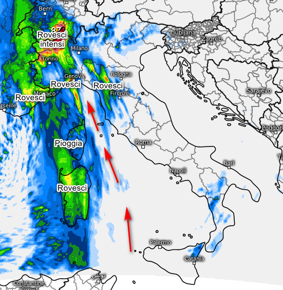 Rovesci intensi e persistenti tra val d’Aosta, alto Piemonte e Alpi occidentali con quota neve oltre i 2000 metri. Rovesci alternati a pause sul resto del nord-ovest, Corsica, Sardegna, anche occasionalmente accompagnati da temporali. Rovesci anche in corrispondenza dell’Appennino Tosco-Emiliano, per il resto assenza di fenomeni. Scirocco in deciso rinforzo su tutti i bacini di ponente e il Mar Ligure.