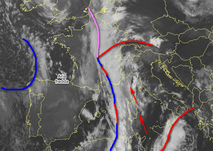 Ecco la terza perturbazione della serie, che come avevamo anticipato sarà la più intensa di tutte. Si staglia dal Mediterraneo occidentale al Golfo del Leone, ma il suo moto verso levante risulta lento e macchinoso per due motivi: il primo è legato ad una zona di alta pressione che si schiererà più ad est, impedendo alla perturbazione di spostarsi; il secondo motivo è invece prettamente sinottico, ovvero il corpo nuvoloso nelle prossime ore si svincolerà dal flusso atlantico principale, evolvendo in un minimo chiuso, un piccola circolazione ciclonica che si piazzerà tra la Corsica e il Mar Ligure, in lento colmamento a partire dalla seconda parte di giovedì.
