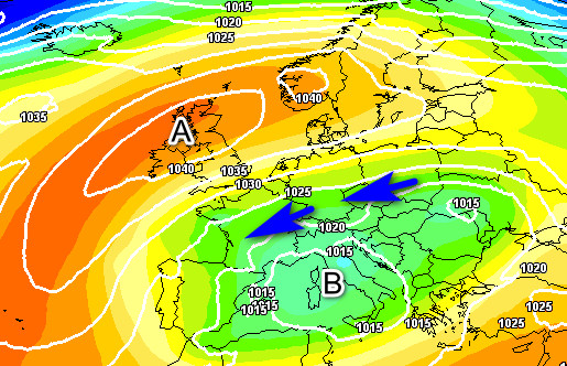 L’alta pressione ricoprirà lidi molto settentrionali, mentre da noi sarà presente una depressione alimentata da aria fredda di matrice orientale che interesserà in modo particolare il settentrione e parte del centro, dove ci attendiamo ancora nevicate a quote relativamente basse.