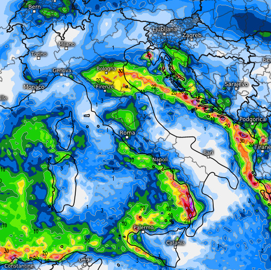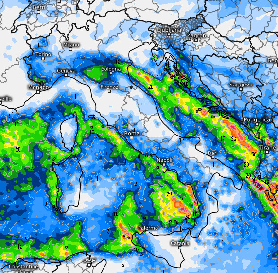 Ancora rovesci sull’Emilia Romagna fra Reggio Emilia e Bologna, nevosi in Appennino oltre i 500-700 metri. Qualche nevicata sarà presente anche sull’Appennino centrale oltre 900-1.200 metri. Sul resto d’Italia tempo instabile con rischio di acquazzoni soprattutto sul medio-basso Tirreno, la Sicilia occidentale e intermittenti su gran parte della Sardegna. Probabili piogge abbondanti su alcuni tratti della Costa Tirrenica Calabrese e della bassa Campania.