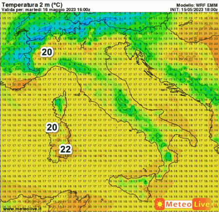 Infine, queste sono le temperature attese in Italia alle ore 16 di oggi, martedi 16 maggio: